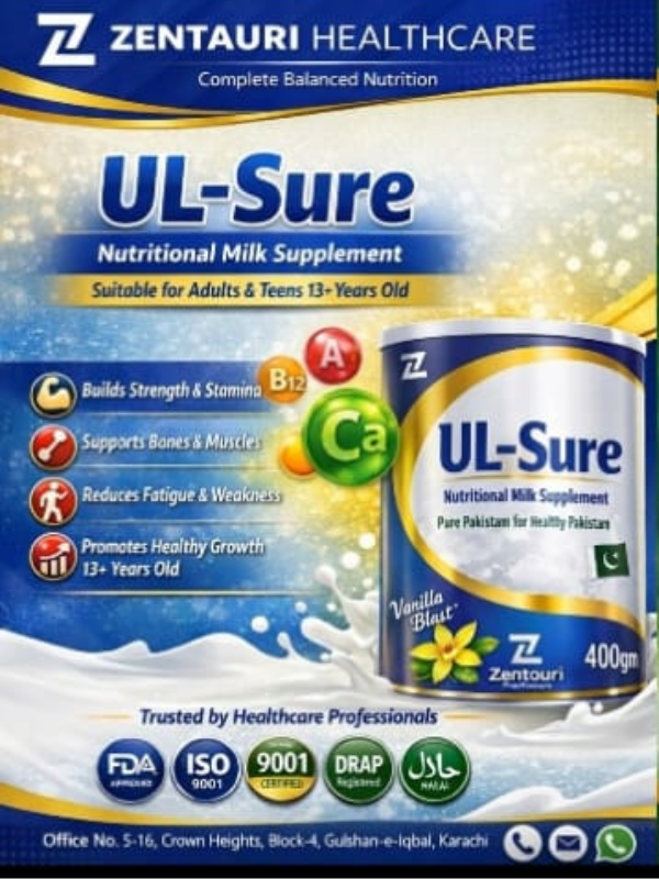 UL-Sure is a scientifically formulated nutritional milk supplement crafted to deliver complete, balanced nourishment for modern lifestyles. Designed with a blend of essential vitamins, minerals, and protein, it helps you stay active, strong, and energized throughout the day.
